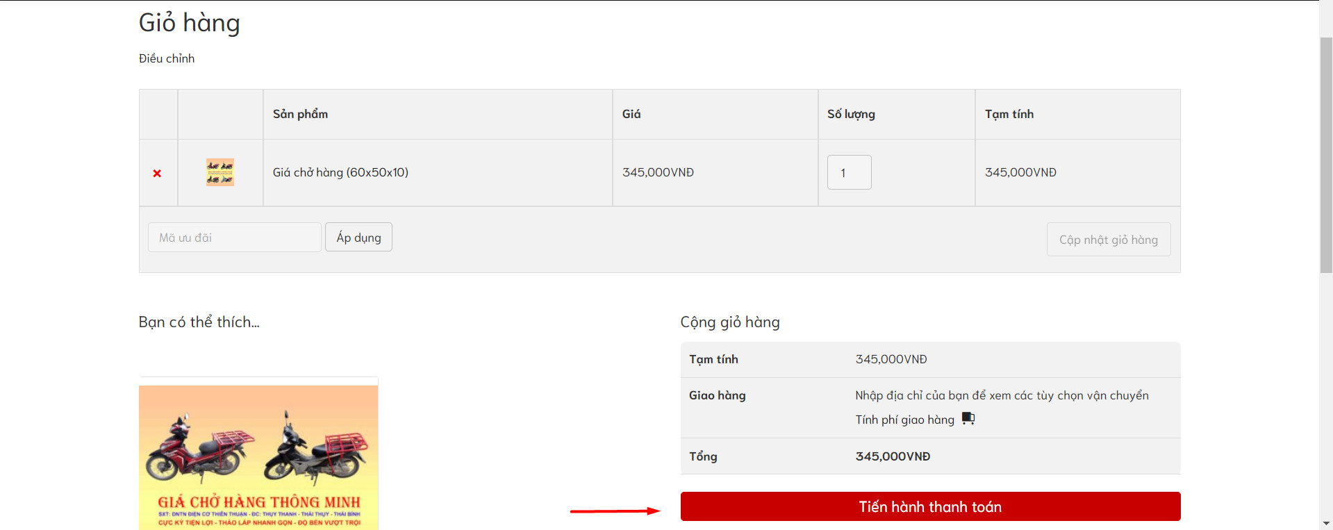 Sau khi kiểm tra đơn hàng xong, khách hàng chọn vào nút “Tiến hành thanh toán”.